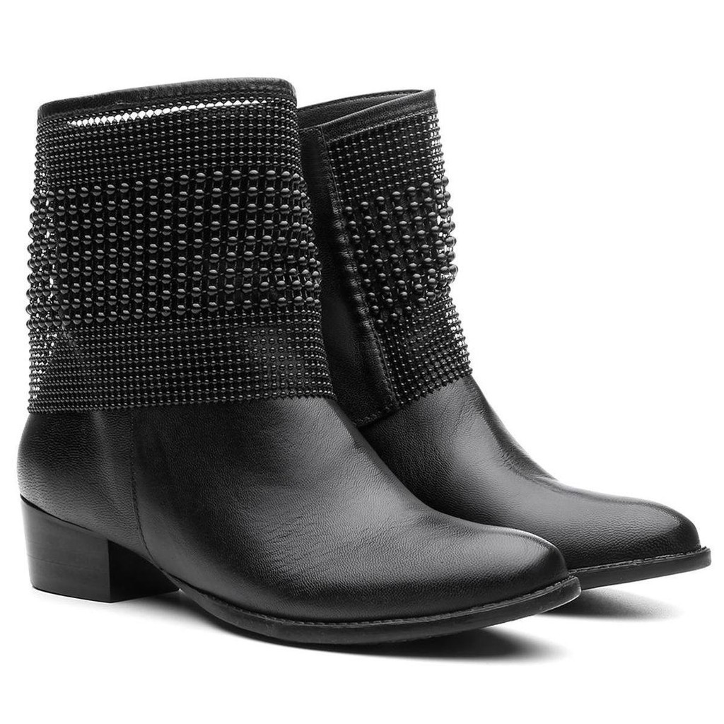 Bota Couro Malha Metal Bico Redondo Cano Curto Salto Baixo