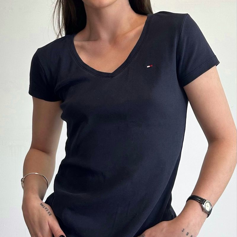 Babylook Tommy Hilfiger Feminina Manga Curta Gola V Basica Reggla