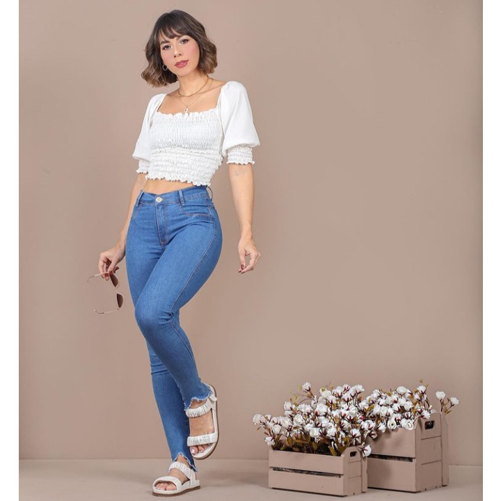 Cal a Jeans Feminina com Barra V Desfiada Cintura Alta com Lycra Levanta Bumbum