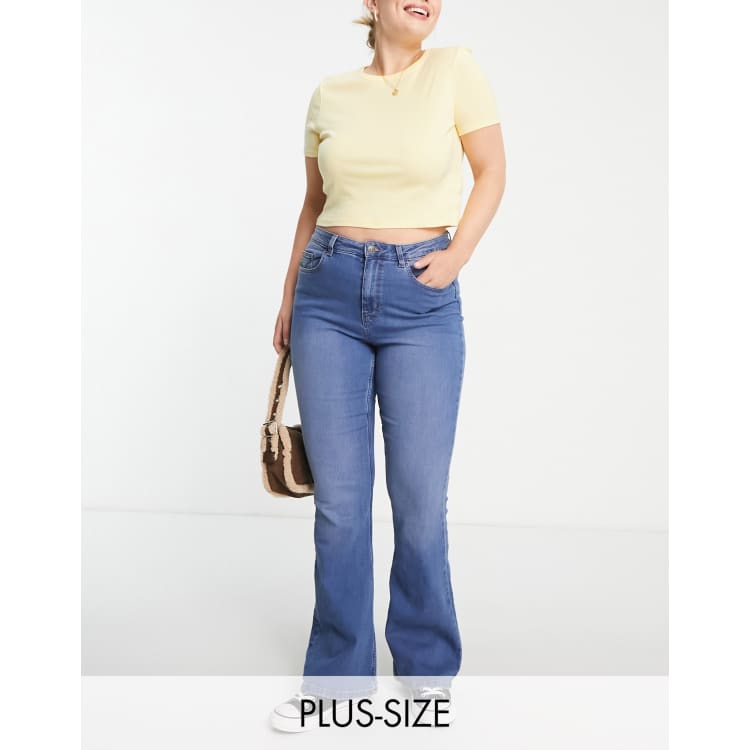 Pieces Curve Peggy high waisted flared jeans in mid wash blue ASOS