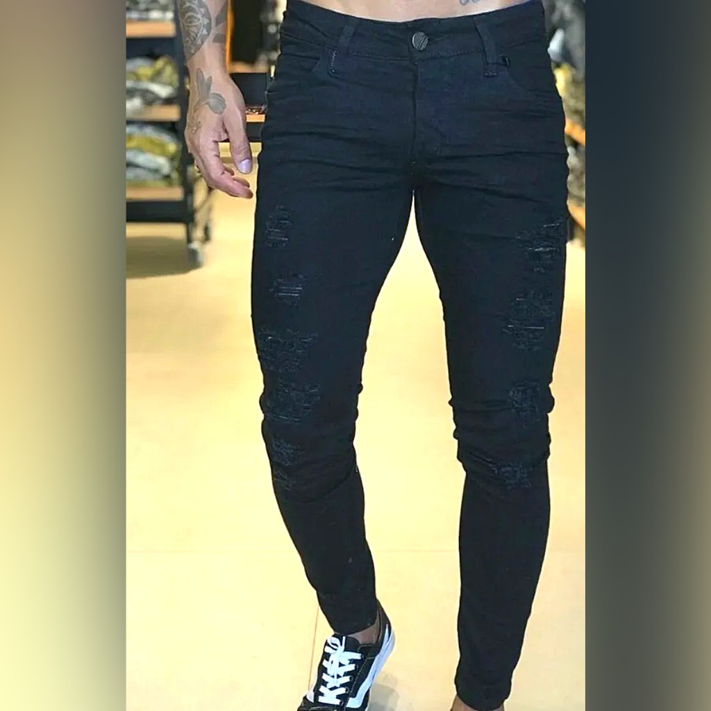 Cal a Jeans Masculina Preta Skinny Destroyed Sem Bainha DJN
