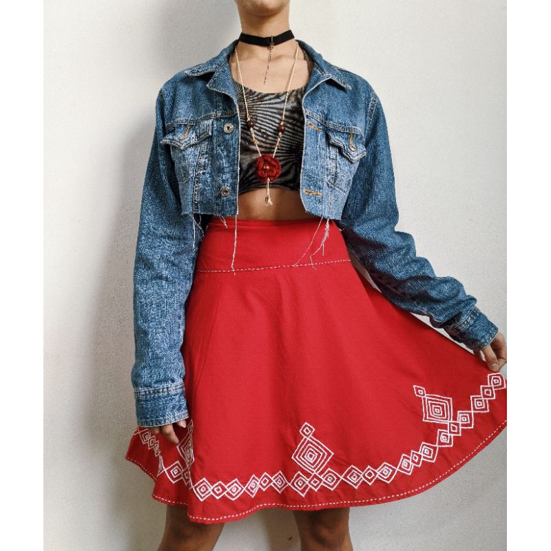 Saia clearance vermelha rodada, Saia rodada vermelha vintage CGC cintura alta bordada a m o Brech clearance