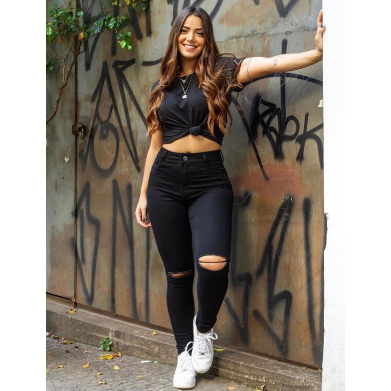 Cal a Feminina Skinny Preta Estica No Corpo Rasgada Joelho