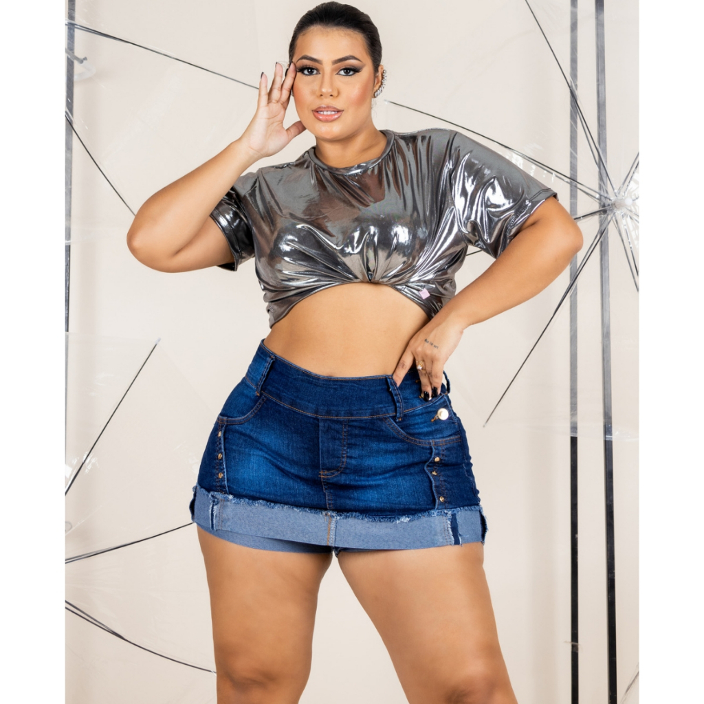 Short saia jeans com p rolas plus size Camilly Plus Size