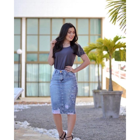 Saia Plus Size Jeans com P rolas e Renda com Babado na Barra Best