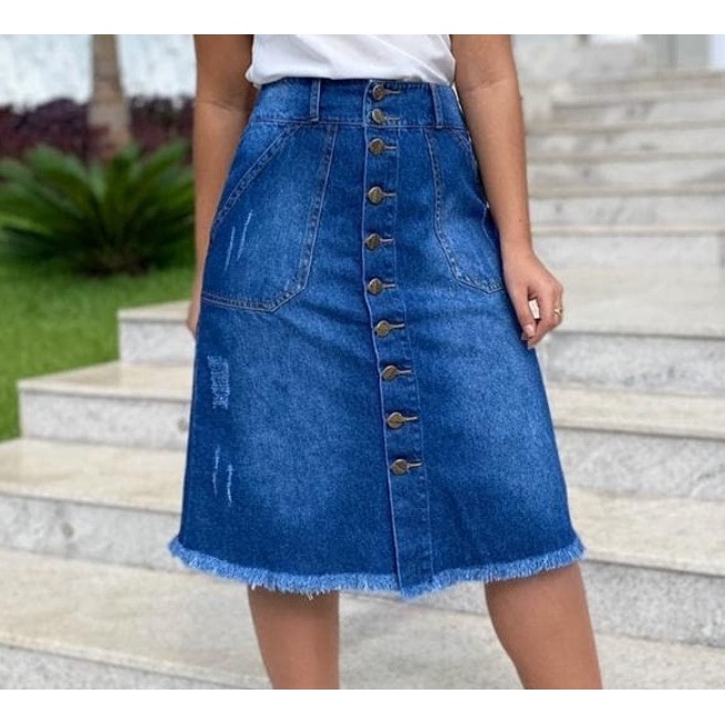 Saia evasê com clearance botões, Saia Jeans Evas Com Bolsos E Bot es Frontais clearance