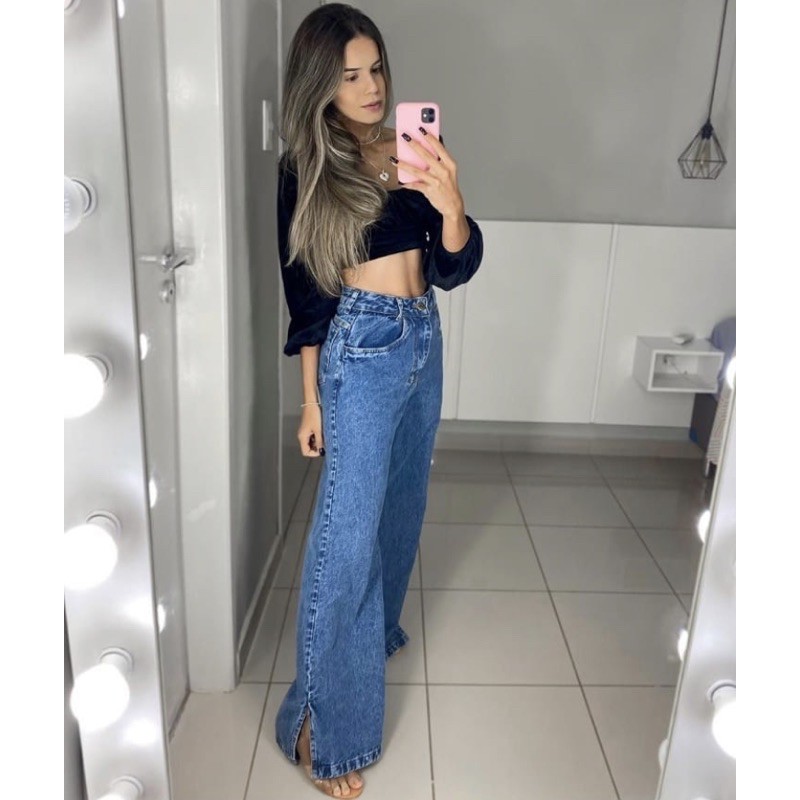 Cal a Wide Leg Jeans Pantalona Com Fenda Lateral Moda Blogueira Estilo Gringa