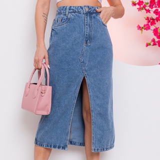 Saia Midi em Jeans com Fenda Frontal e Costura Contrastante Azul