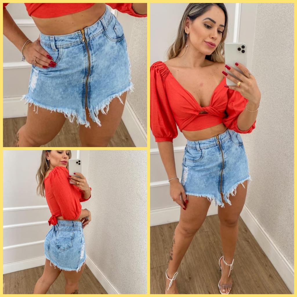 Saia Jeans Cos Alto Cintura Alta Ziper Frontal Carnaval 2022