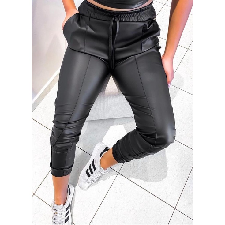 Calca Jogger Feminina Cirre Preto Couro Fake Moda Blogueira