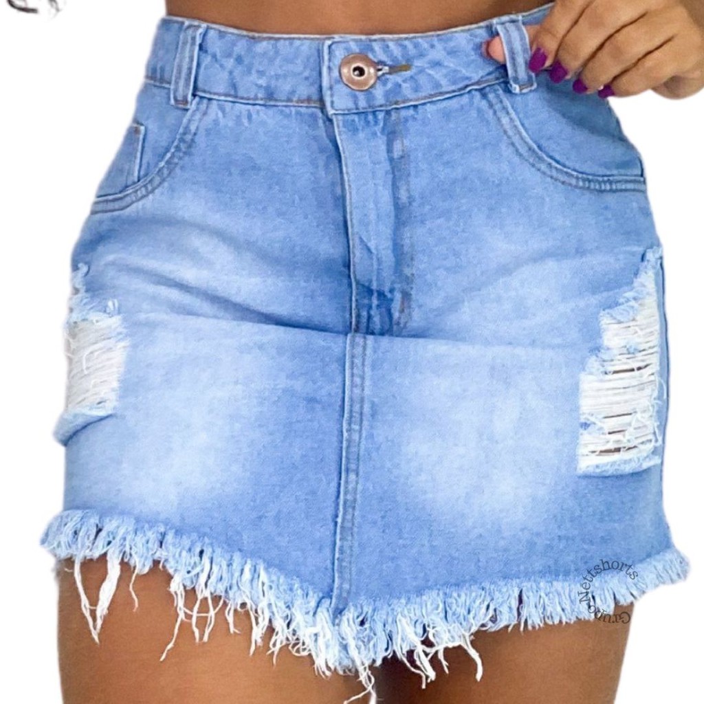 Saia Jeans Claro Feminina Cintura Alta Destroyed Shopee Brasil