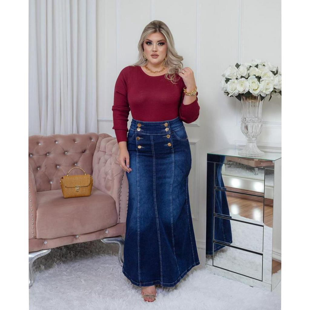 Saia Jeans Longa Justa Elastano Moda Evang lica Feminina