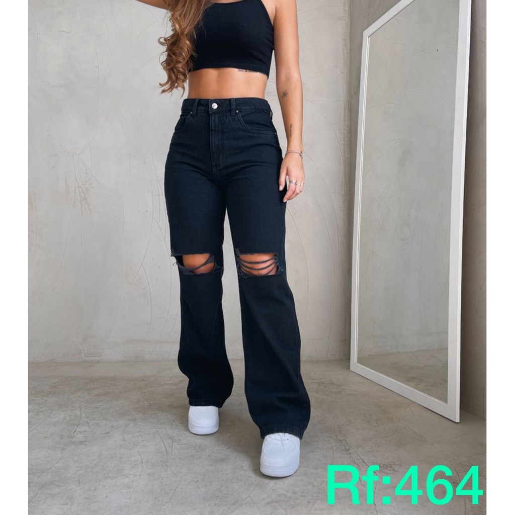 Cal a Jeans Feminina Preta Wide Leg Pantalona Destroyed Rasgada No Joelho Boca Larga Da Lolastores