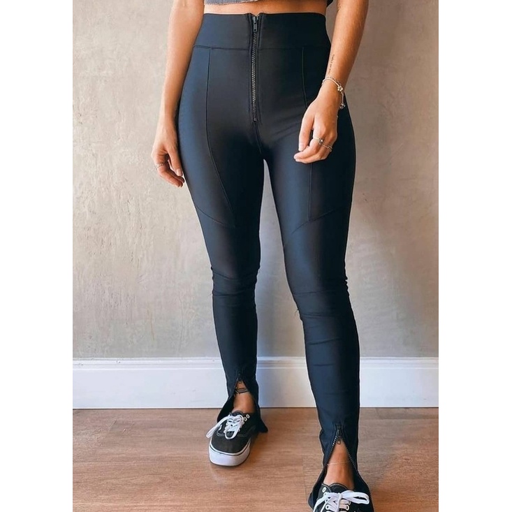Calça moletom colada clearance feminina, Cal a legging feminina 3 ziper cirr couro ecol gico z per na barra colada clearance