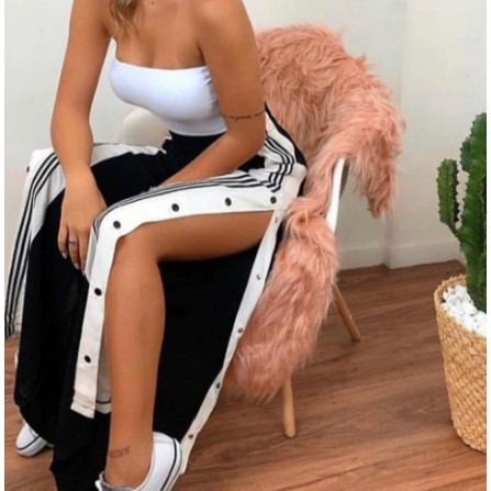 Calça pantalona fenda clearance listra botões laterais, Cal a Pantalona Feminina Aberta Fenda Listra com Bot es Laterais clearance
