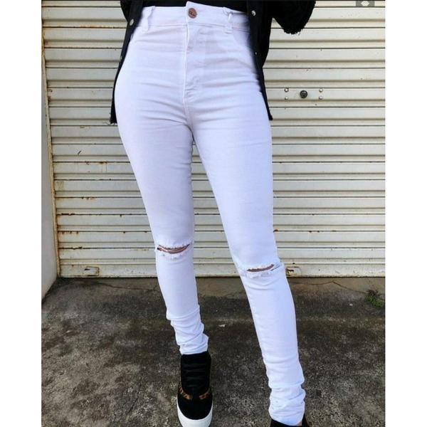 Cal a Jeans Feminina Branca Rasgada No Joelho Cintura Alta Empina Bumbum