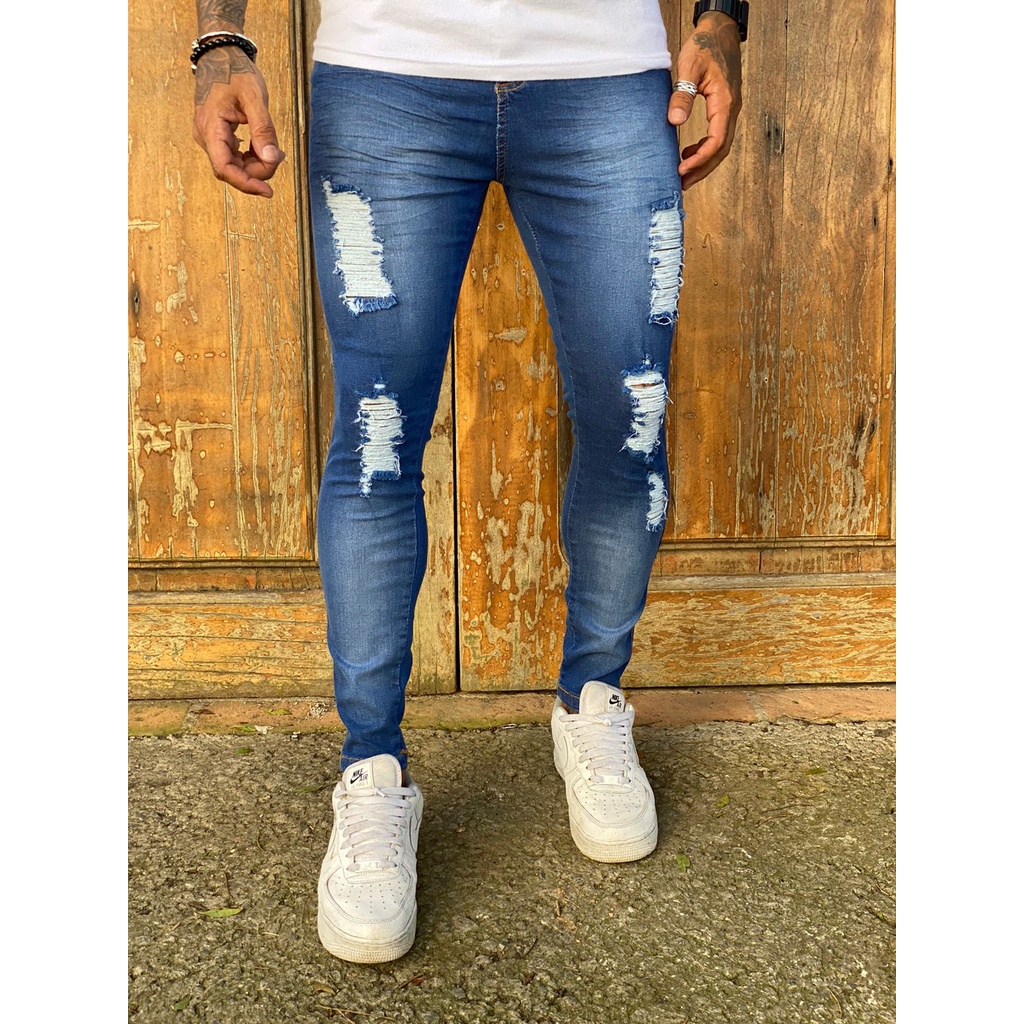Cal a Skinny Com Lycra Jeans Rasgado Detroyed Masculina Tendencia Exclusivas