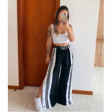 Cal a feminina jogguer aberta lateral com bot es preta e branca