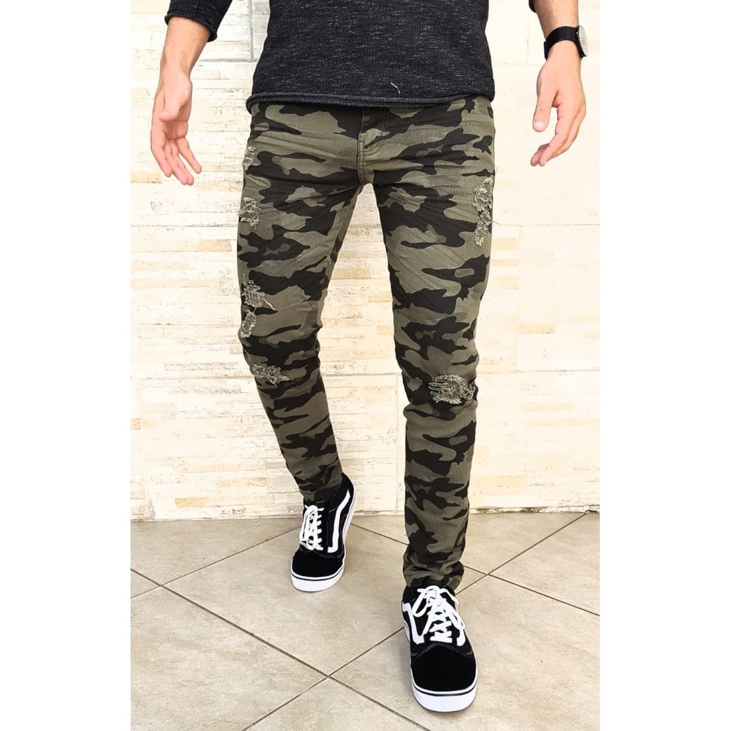 Cal a Jeans Masculina Camuflada Militar Slim Fit Destroyed