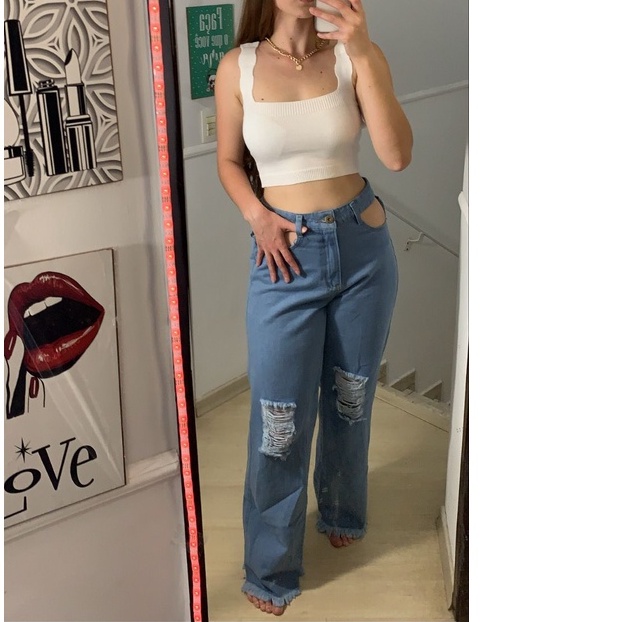 Cal a jeans wide leg feminina bolso vazado destroyed linda rasgada linda jeans