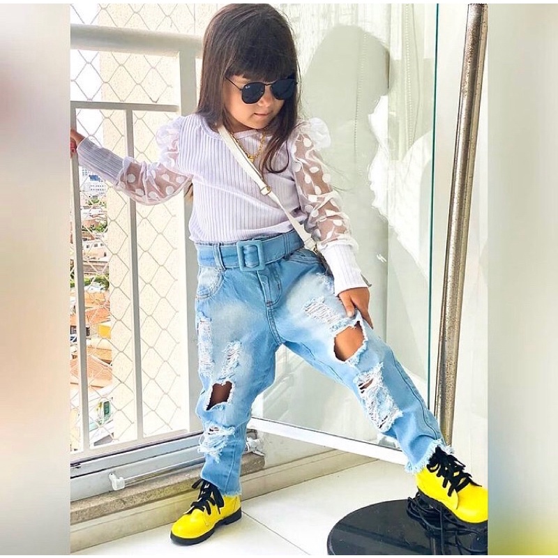 Cal a Jeans Menina Infantil Cal a Jeans Infantil Rasgada com Cinto cal a jeans de menina moda blogueirinha