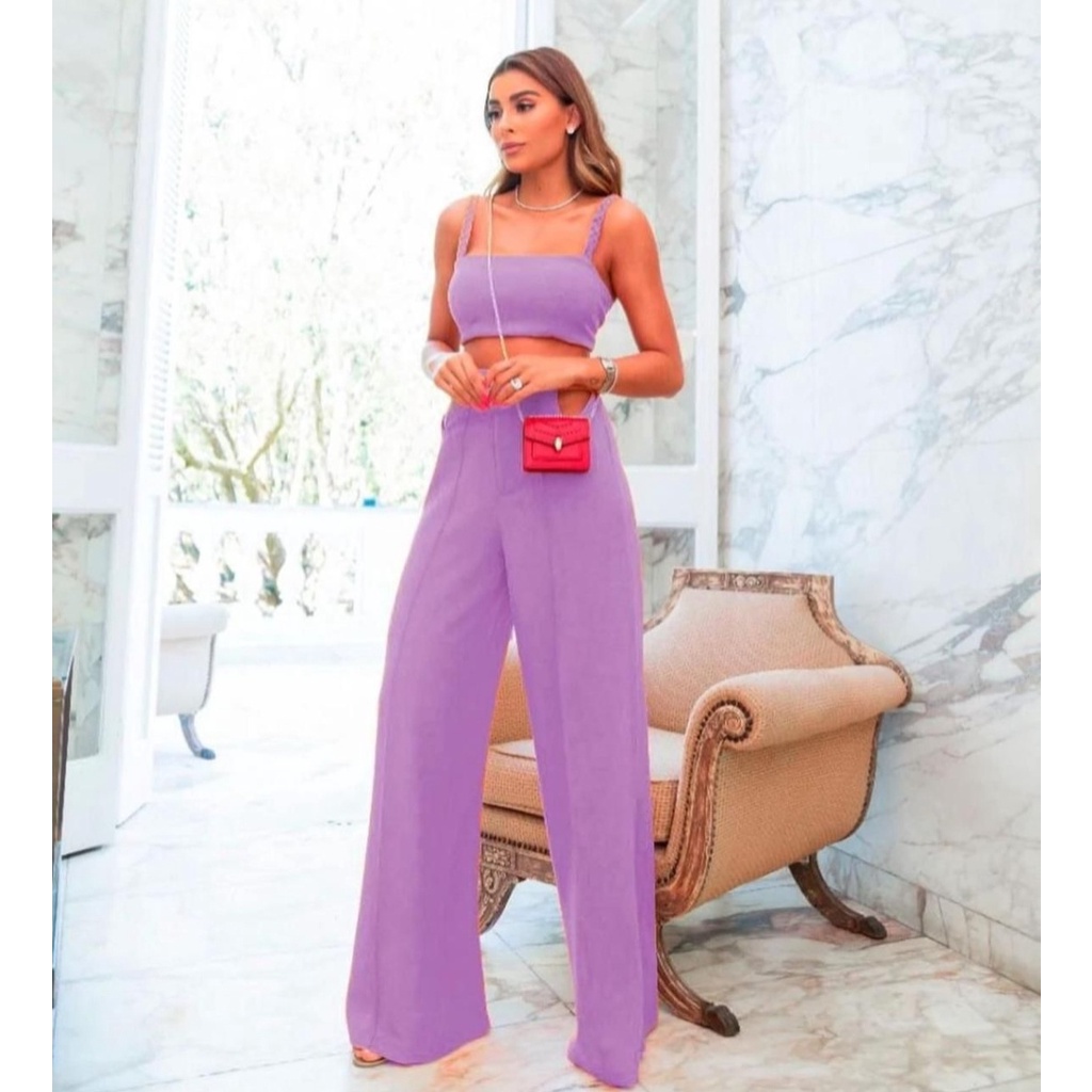 Conjunto Cropped Al a e Cal a Pantalona Flare Boca Larga de Sino Vazado Abertura Cintura Lateral Luxo Chique