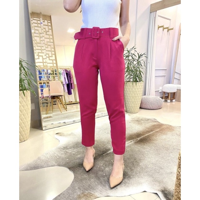 Calça clearance pink alfaiataria, Cal a em alfaiataria pink com T shirt branca clearance