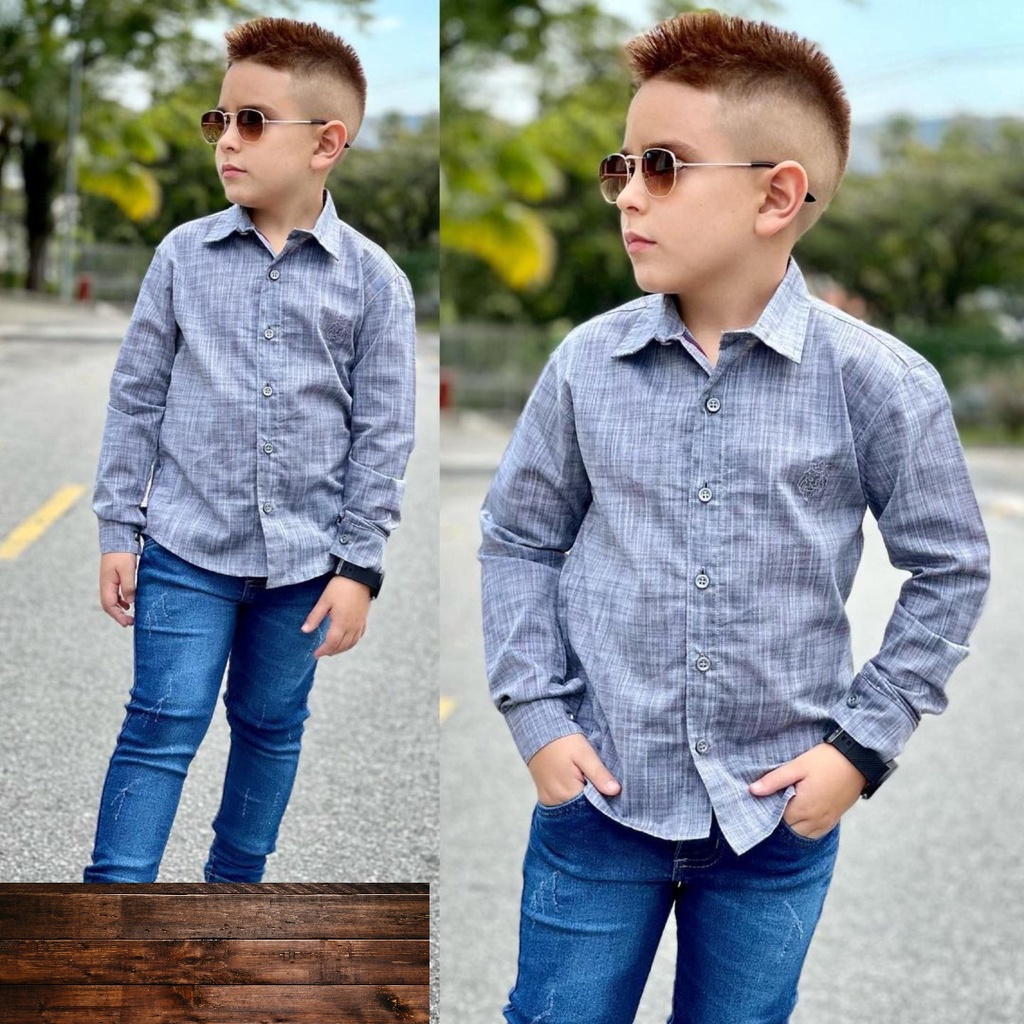 Roupa Menino Infantil Camisa Manga Longa Linho Cinza Cal a Jeans