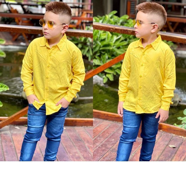 Calça jeans e clearance camisa social infantil, Roupa Menino Infantil Camisa Manga Longa Linho Amarela Cal a Jeans clearance