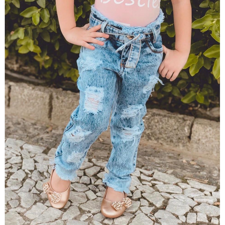 Cal a Jeans Infantil Destroyed Com Cinto De Amarrar Menina Blogueira Blogueirinha Rasgadinha Mini Influencer Digital