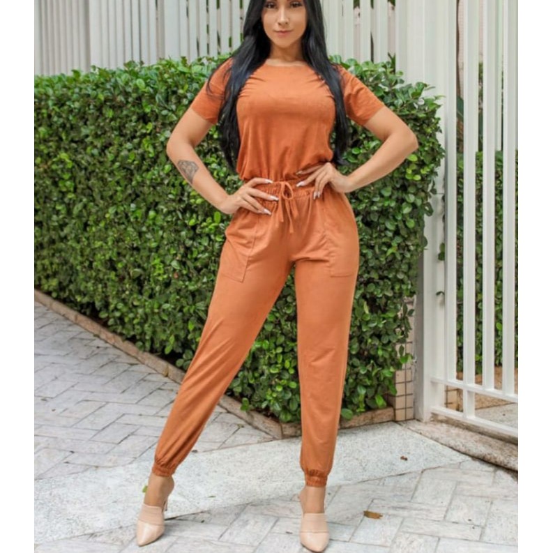 Conjunto feminino suede cal a jogger manga curta moda blogueira