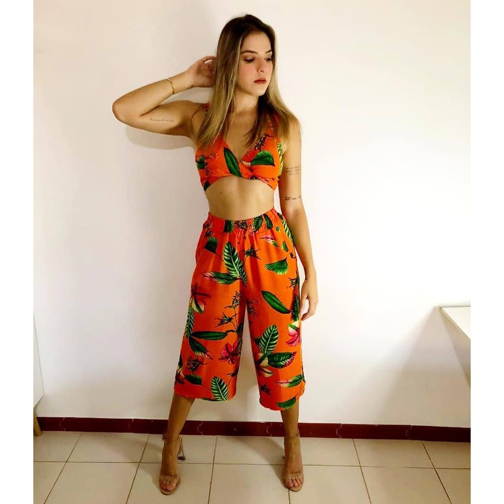 Calça pantacourt com clearance top cropped, Conjunto Feminino 2 Pe as Blusa Cropped Cal a Pantacourt Areia clearance