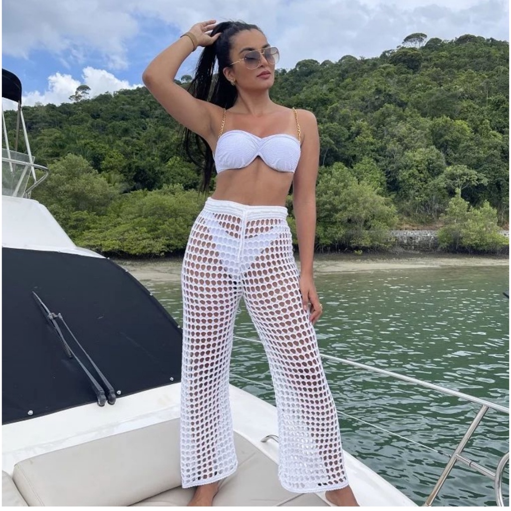 Cal a Saida de Praia Feminina Tricot Croche Flare Cintura Alta