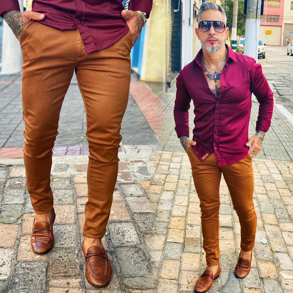 Calça caramelo com clearance blusa azul, Cal a Sarja Masculina Alfaiataria Slim Caramelo Super Skinny Com Elastano Oferta Pronta Entrega clearance