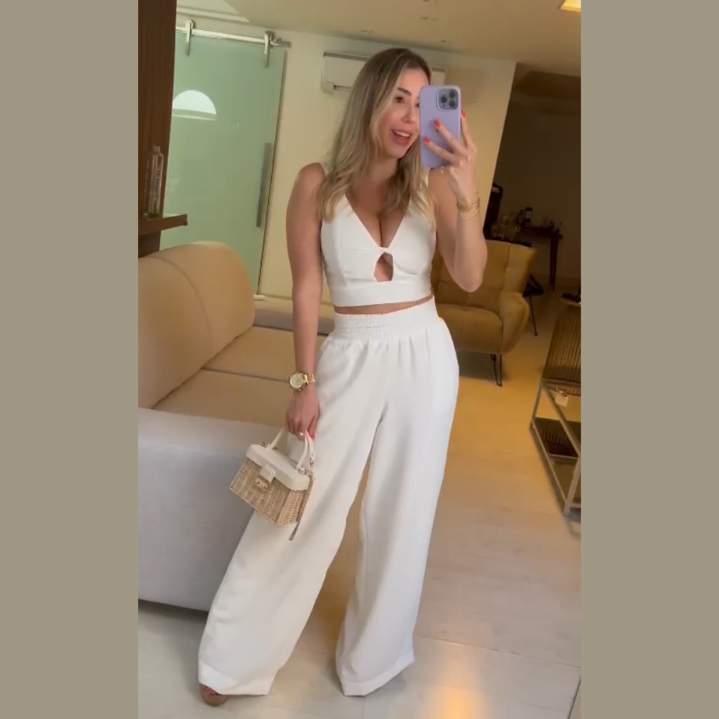 Conjunto feminino cal a pantalona e cropped Branco Tamanho M