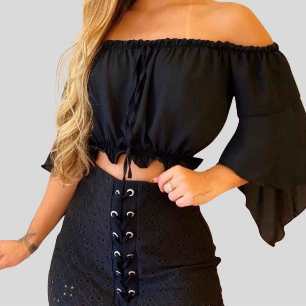 Cropped Manga Longa Boca de Sino Flare Ombro a Ombro Ciganinha El stico B sico