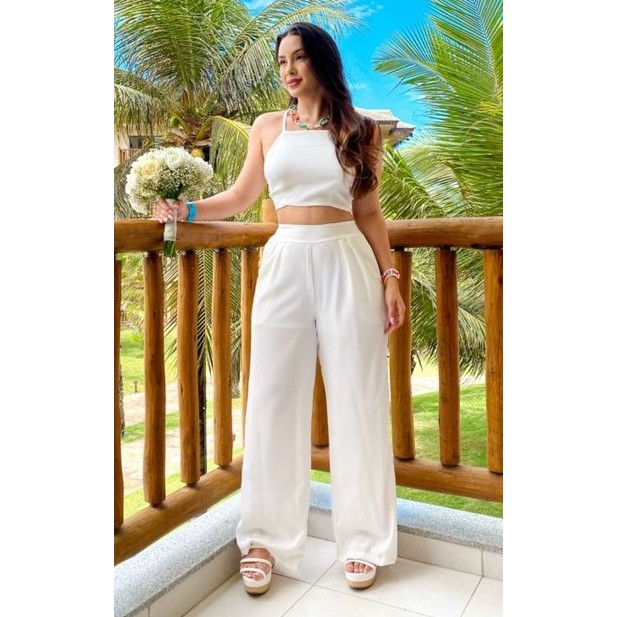 Conjunto Feminino Branco Ano Novo Ver o Cal a Pantalona e Cropped Reveillon