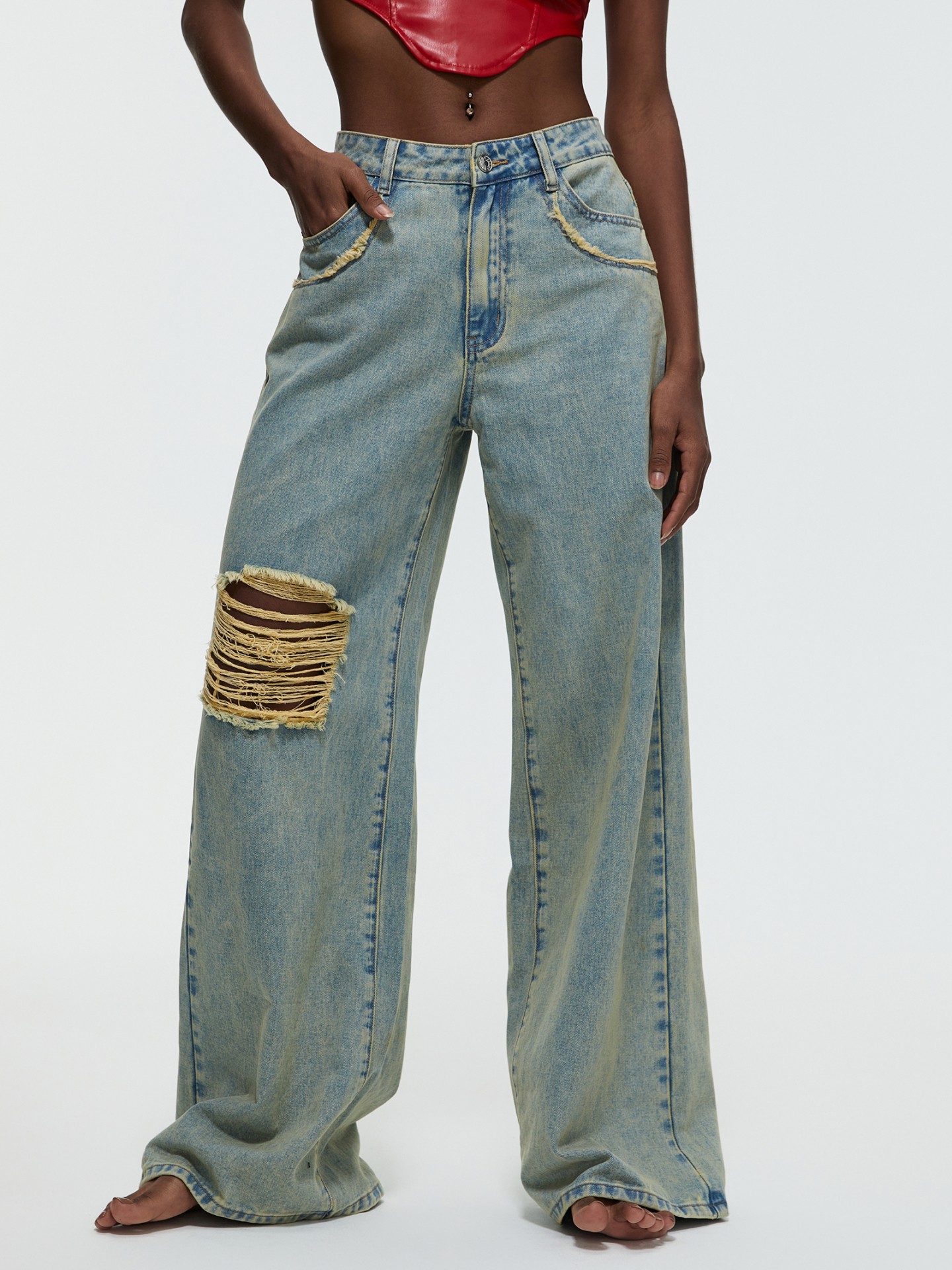 Cal a Jeans Perna Larga fashion Rasgado casual cintura alta Z