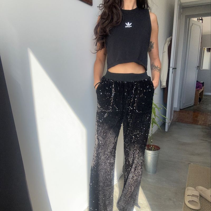 Cal a Preta Paete Brilho Festa Chic John John Pantalona Wide Cintura Alta Fenda Perna Cal a Feminina John John Usado 88419255 enjoei