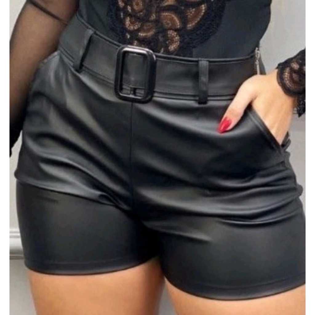 Short feminino Couro Fake Tecido Cirre Shorts Preto de Fivela