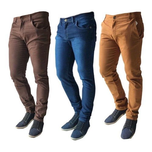 kit 3 calca sarja jeans masculina slim com lycra colorida