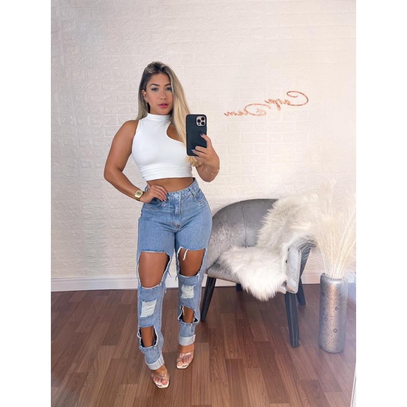 Cal a jeans feminina rasgada com bainha alta e cintura destru da