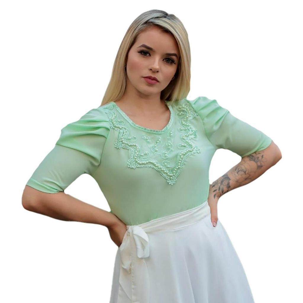 Blusa Feminina Manga 3 4 em Crepe Social Crepe e Renda Moda