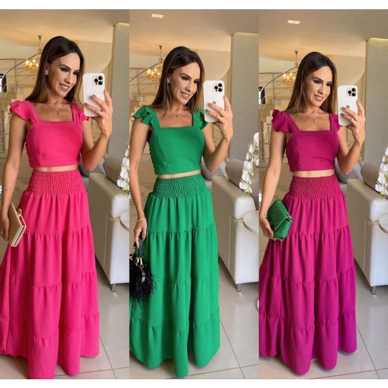 Conjunto Maria Alice Saia Longa Tr s Maria e Blusa Cropped com Bojo Duna Luxo Festa