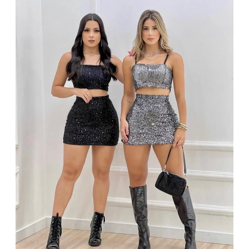 Conjunto Saia E Cropped Festa Luxo Brilho Paete Blogueira Shopee