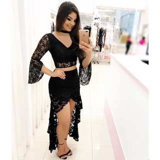 Conjunto renda cropped babado e saia longa mullet novidade cfs 536