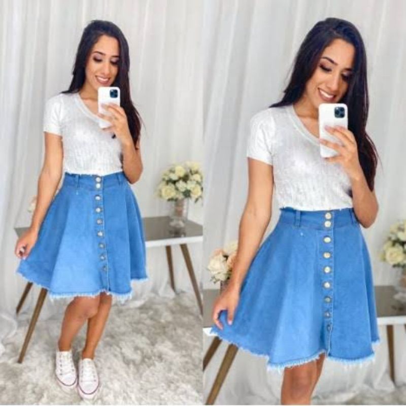 Saia clearance godê jeans, Saia Jeans God com bot o metalizado acinturada curta Moda clearance