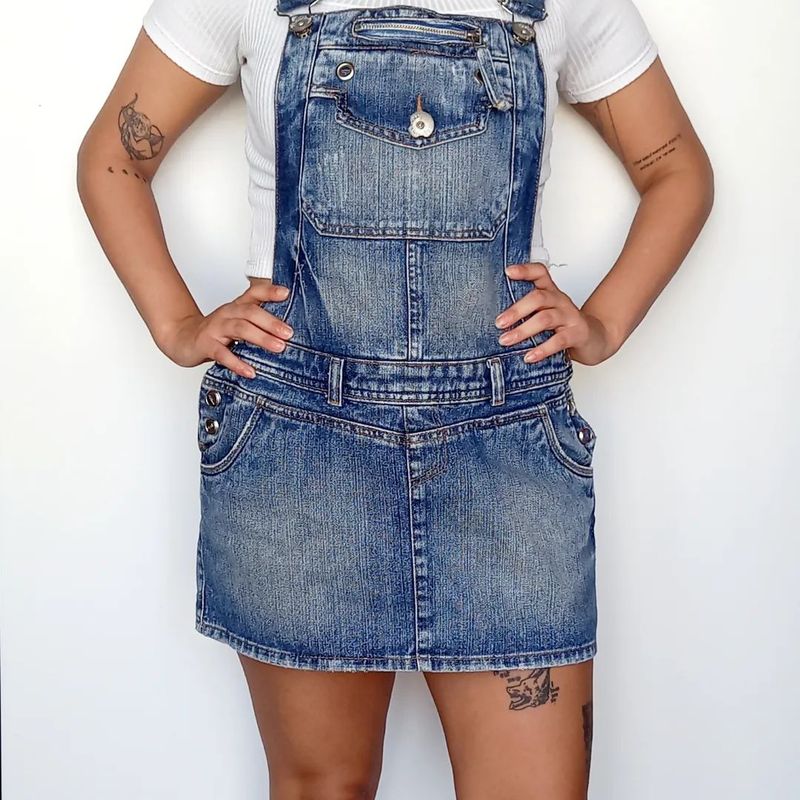 Jardineira clearance curta saia, Jardineira Saia Longa Jeans Plus Size clearance