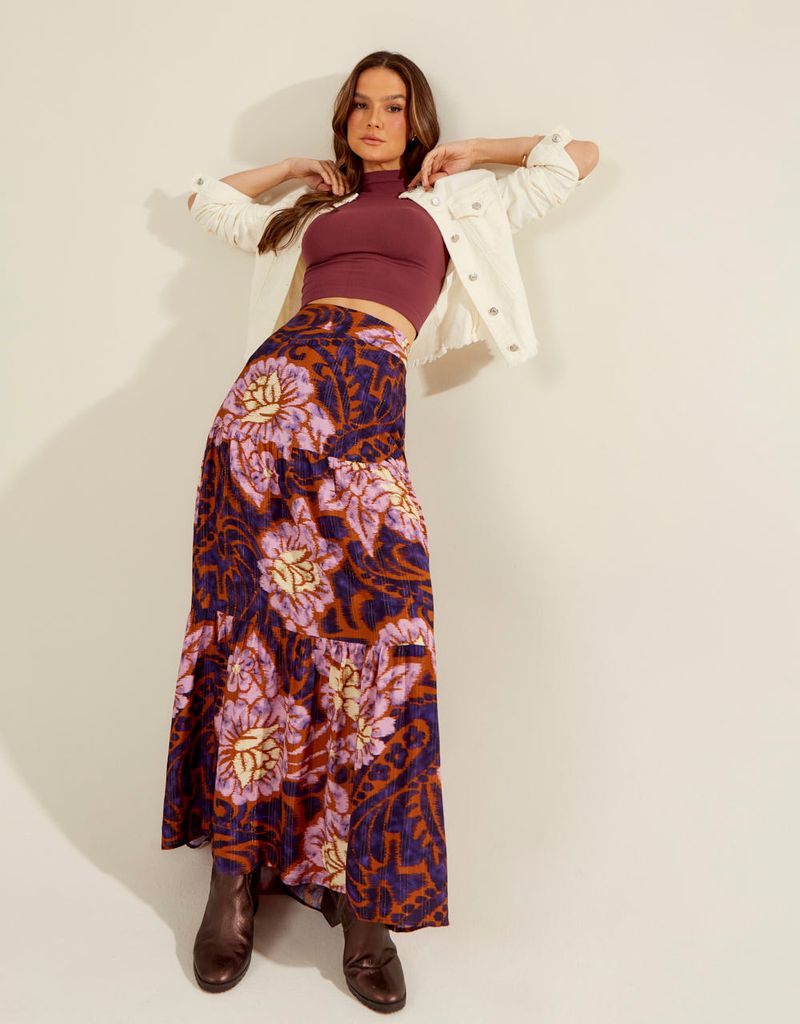 Saia Longa Estampada Violeta Caramelo Zinzane Loja de Roupas Femininas Bazar At 70 OFF