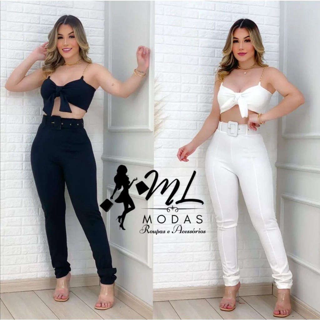 Conjunto Feminino Cropped com Al as em Corrente com Bojo Cal a com Cinto Preto Branco Conjuntos Feminino Roupas Feminina